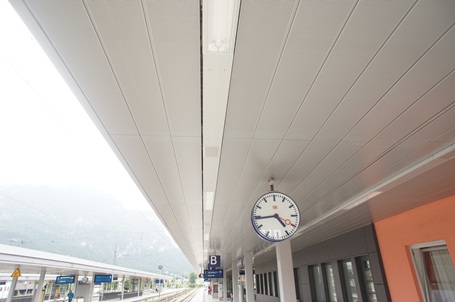 Abgehängte ORIGINAL DOBNER Aluminium-Paneeldecke in einem Fernbahnhof